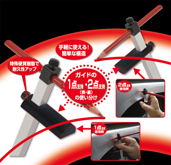 軽補修において意外と多いホイルハウス部分の板金。特にプレスライン出しが簡単なようでなかなか難しい面倒な作業です。 このナビライナーⅢは、ホイルハウス部分のプレスラインに簡単に目印をつける便利ツールです。取扱も簡単で、作業時間の短縮に、経験の浅いボディーマン・スプレーマンにも使用できます。