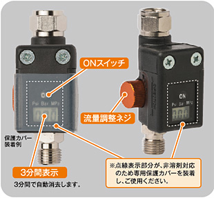 ● このデジタル手元圧力計TMS-D01は弊社オリジナルの手元圧力計で、デジタル表示・コンパクトサイズ・軽量(95g)・流量調整付を実現。 |